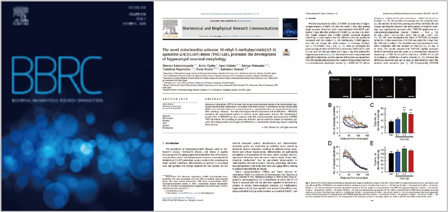 オランダのエルゼビア出版が発行するBBRC(生化学、生物物理学誌)に、2021,6月掲載「ミトコンドリア活性因子である5-デアザフラビン(TND1128)の海馬神経細胞の発達・促進作用について」
